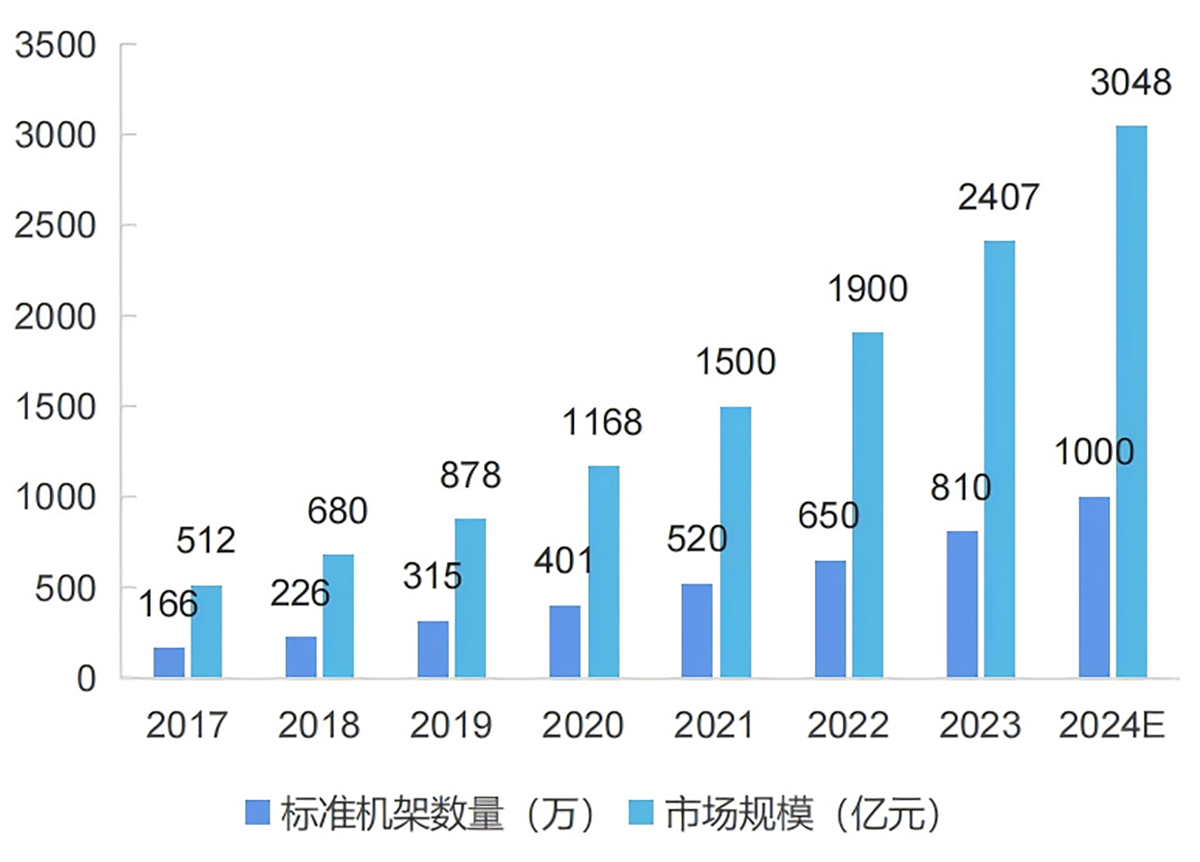 2017-2024年中国内地数据中心在运营标准机架数量及市场规模